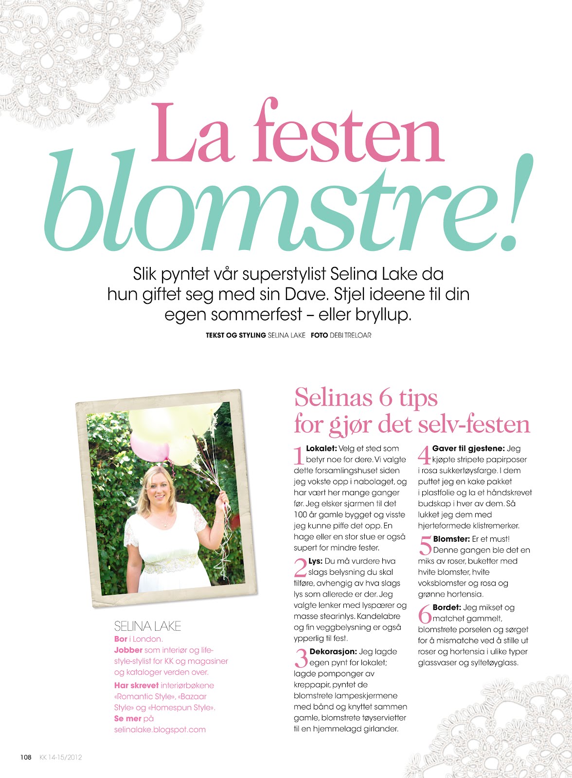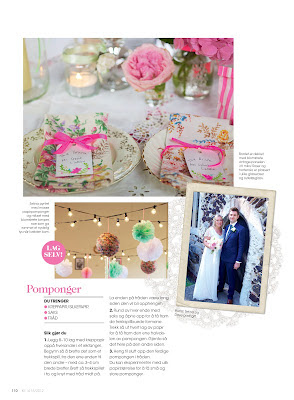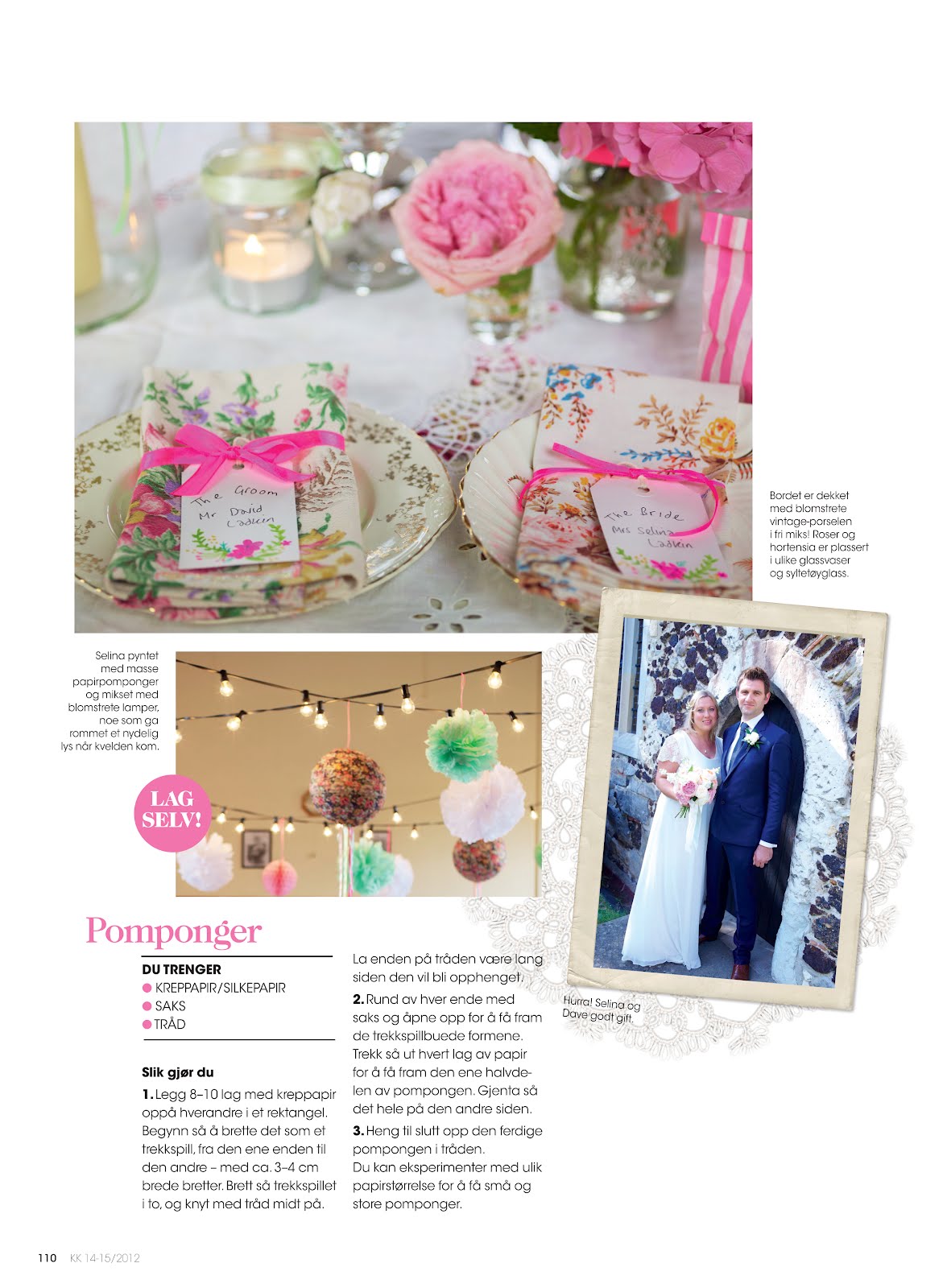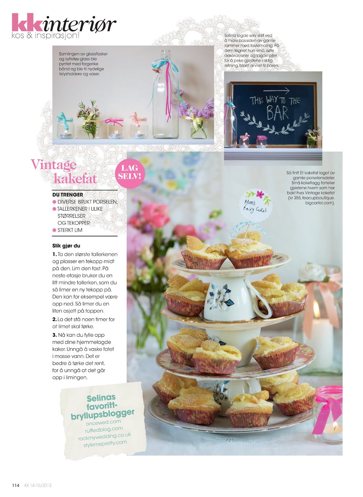 I’m extremely excited to have Our Wedding featured in my favorite Norwegian KK Magazine recently. The 6 page feature includes all my styling tips for a Floral theme wedding reception or Party with photography by Debi Treloar of my very own Wedding day. Featuring the gorgeous vintage china cakestand made by my cousin Hannah available to buy via her shop Teacup Boutique – which I used on our dessert/cake table with my mums yummy fairy cakes displayed. Plus my ideas for making hankie bunting, cute blackboard signs and hand sewn personalised floral napkins.