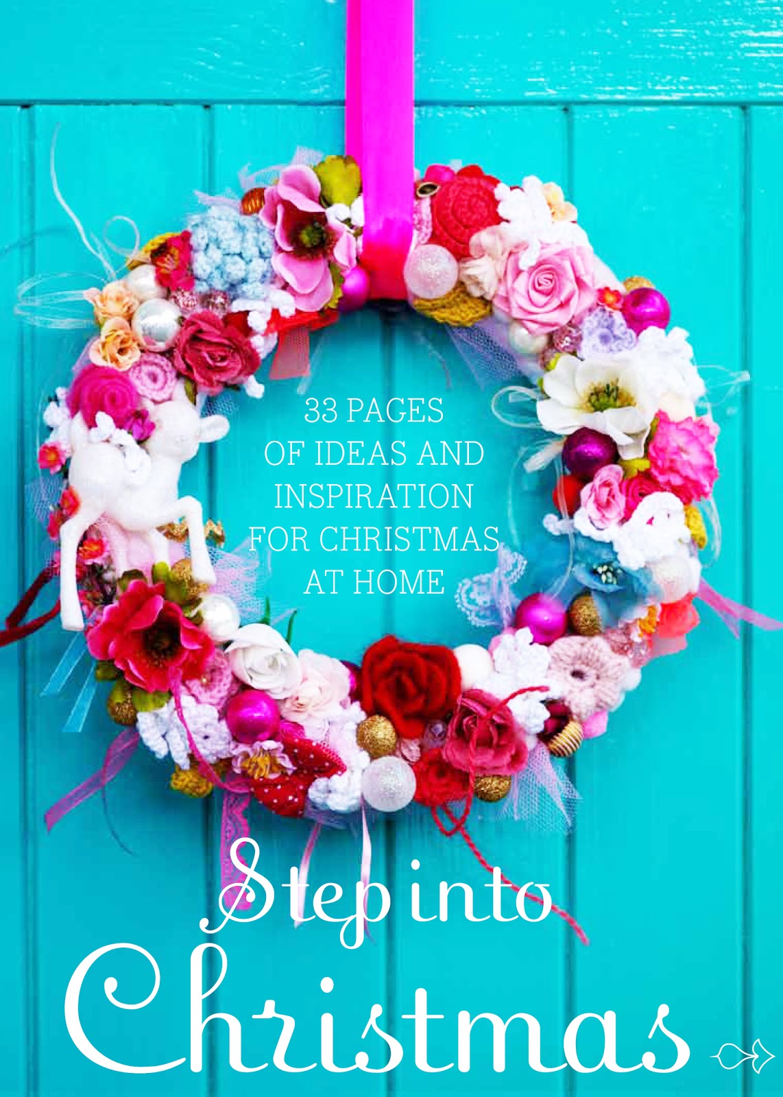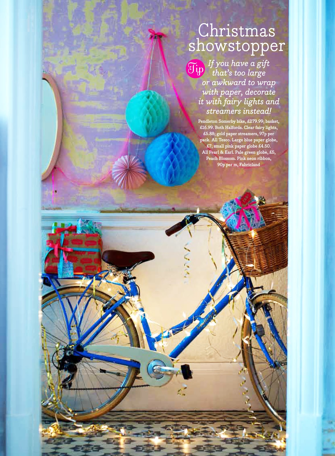 A little while ago I was commissioned to Style a Handmade Christmas feature for the Dec Issue of Prima Magazine, I decided to choose bright and colourful products to feature in the article, plus some DIY decorations, gift wrap ideas and festive dining. The gorgeous wreath above made by Silly Old Suitcase opens the show and is available to buy here. I enjoyed decorating the Victoria Pendelton Bike from Halfords with gold streamers and fairy lights, I also feature lovely gift wrap by Kirsty Baynham & Stormy Knight , Paper decorations from Peach Blossom & Pearl & Earl – to see the full feature pick up a copy of the Dec issue on newstands now…. Also don’t forget I’ll be at Prima Magazine Stage Area at Birmingham’s NEC for ICHF Craft’s for Christmas Show this thurs 8th to Sun 11th, demonstrating some of the ideas in this feature plus more Homespun Festive Makes and selling signed copies of my current book Homespun Style, buy tickets for the show HERE. Hope to see you there x