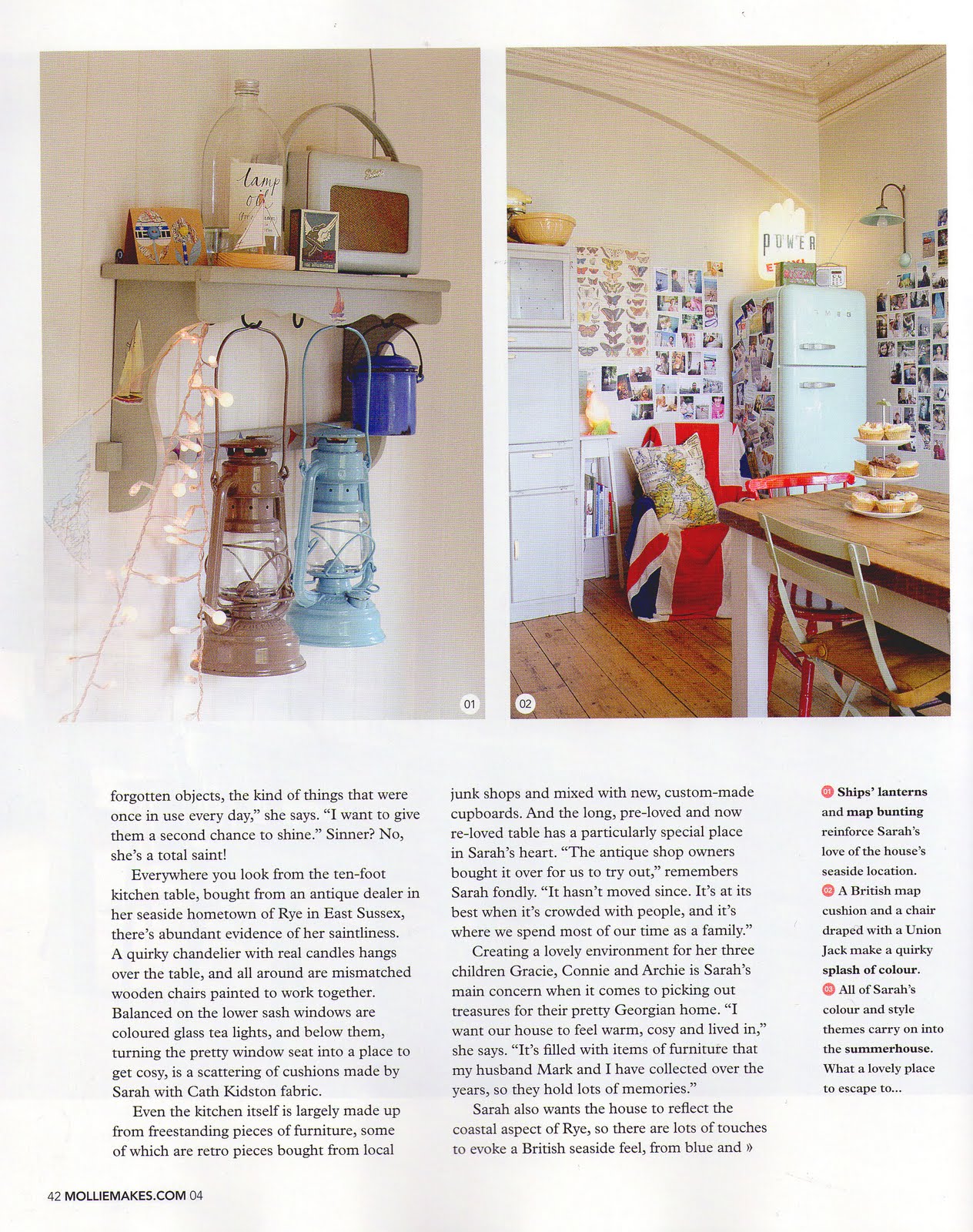 These tearsheets are from a feature I styled and wrote for brilliant new making, crafting, thrifting and collecting magazine, Mollie Makes, issue 4. The feature is a home tour of the very lovely, Sarah’s Home in Rye, East Sussex. Sarah is currently in the process of opening her own design lead family store, Lion Street Store in Rye, where she plans to sell works by Rob Ryan, Donna Wilson, Lisa Stickley, and copies of my 1st book Bazaar Style. I’m a big fan of Mollie Makes so its fab to have one of my features in their current issue.